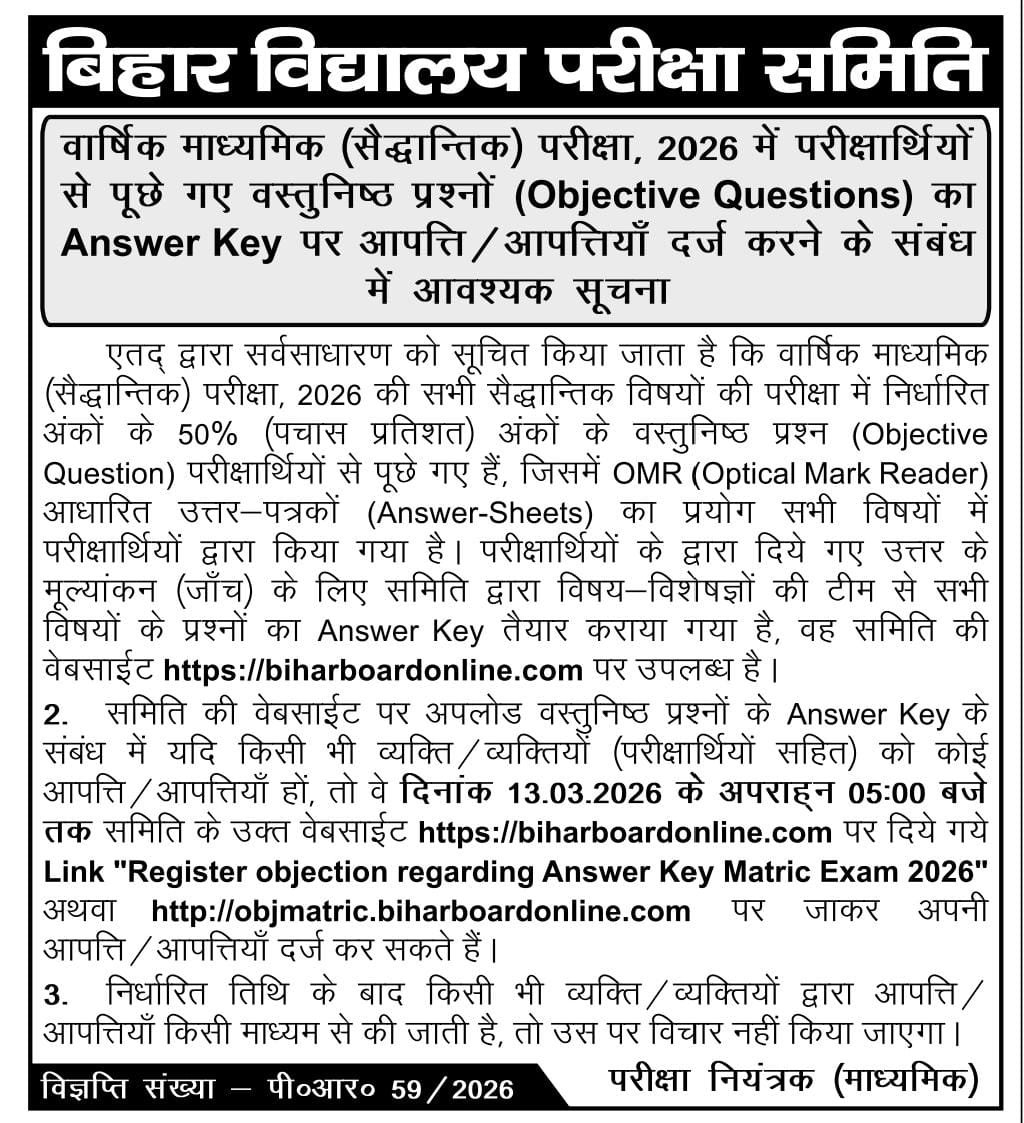 बिहार बोर्ड द्वारा जारी सूचना के अनुसार छात्र 13 मार्च 2026 शाम 05:00 बजे तक Answer Key पर आपत्ति दर्ज कर सकते हैं।