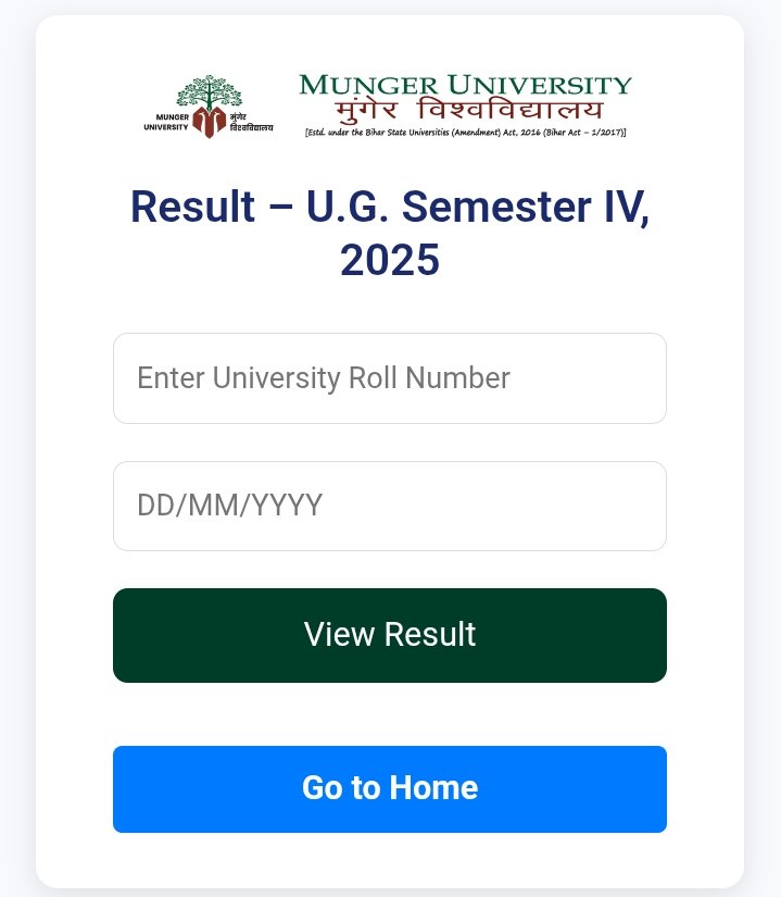 Munger University द्वारा U.G (CBCS) Semester-IV सत्र 2023-27 परीक्षा 2025 का रिजल्ट आधिकारिक रूप से जारी कर दिया गया है। वाणिज्य, विज्ञान एवं कला संकाय के सभी विद्यार्थियों का परिणाम प्रकाशित हो चुका है। जो छात्र-छात्राएं इस परीक्षा में शामिल हुए थे, वे अब ऑनलाइन अपना रिजल्ट चेक कर सकते हैं।