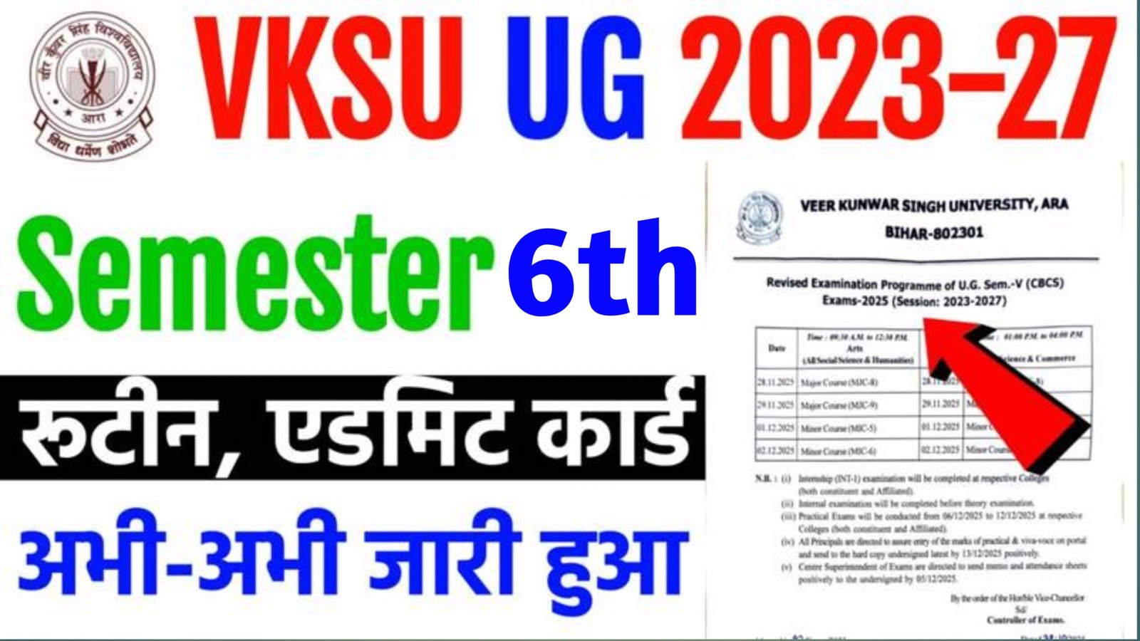 VKSU UG 6th Semester Exam Date 2026 OUT: नमस्कार दोस्तों स्वागत है आप सभी को एक और नए आर्टिकल में वीर कुंवर सिंह यूनिवर्सिटी आरा ने स्नातक सत्र 2023- 27 के 6th सेमेस्टर का एग्जाम डेट जारी कर दिया गया है इसी बीच सारे एग्जाम को आयोजित किया जाएगा इसके लिए ऑफिशियल नोटिफिकेशन भी जारी कर दिया गया हैअगर आप Veer Kunwar Singh University (VKSU) के छात्र हैं और UG 6th Semester (CBCS) की परीक्षा 2026 का इंतजार कर रहे थे, तो आपके लिए बड़ी खबर है। यूनिवर्सिटी ने आधिकारिक रूप से UG Semester-VI (Session 2023–27) का Exam Programme जारी कर दिया है।